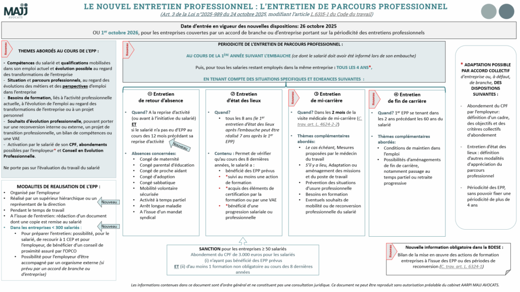 La loi portant transposition des ANI en faveur de l’emploi des salariés expérimentés et relatif à l’évolution du dialogue social (loi n° 2025-989 du 24 octobre 2025) a remplacé l’entretien professionnel par l’entretien de parcours professionnel, avec une nouvelle périodicité et un contenu renforcé.